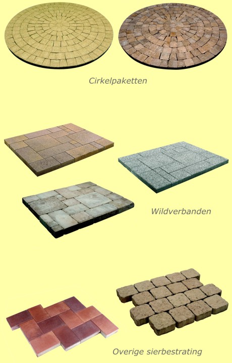 bestratingspatronen aanleggen, van strakke verbanden tot cirkels en waaiers. Een inspirerend lijnenspel waarin u al uw creativiteit kwijt kunt. De vorm die het patroon doorbreekt. De verrassing. Het ongerijmde element. De diversiteit is bijzonder groot; strak en getrommeld beton, kleurvast natuurgranulaat en in vele formaten en kleuren te verkrijgen.